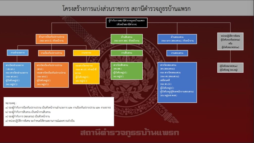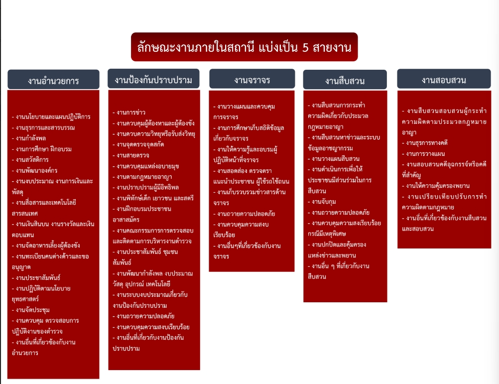 มีหน้าที่เกี่ยวกับการอำนวยการ การวางแผน การตรวจสอบติดตามและประเมินผลงานที่เกี่ยวกับนโยบาย ยุทธศาสตร์ และแผนงานของสถานีตำรวจ งานการบริหารบุคลากร งานจเรตำรวจงานกิจการพิเศษ งานความมั่นคง การศึกษา การฝึกอบรม งานวิชาการ สวัสดิการ การพัฒนา การบริหารจัดการ งบประมาณ การเงิน การพัสดุ การพลาธิการและสรรพาวุธ การส่งกำลังบำรุง รวมทั้งลักษณะงานอื่น ๆ ที่เกี่ยวข้องหรือเป็นส่วนประกอบของงานดังกล่าว เพื่อส่งเสริมหรือสนับสนุนการปฏิบัติงานของสถานีตำรวจ 2) งานป้องกันปราบปราม